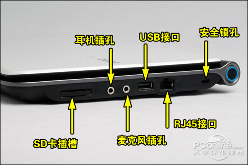 机身右侧列有RJ45网卡接口、SD卡接口、安全锁孔、耳机插孔、麦克风插孔与一个USB接口。