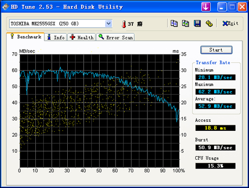 明基U121采用了250GB大容量普通2.5英寸笔记本硬盘,在保证轻薄的同时可以较好的控制成本。通过HD-tune测试软件可以看出这块东芝250GB硬盘的性能表现稍好,平均速度为52.9MB/sec,处理器占用率为15.3%。