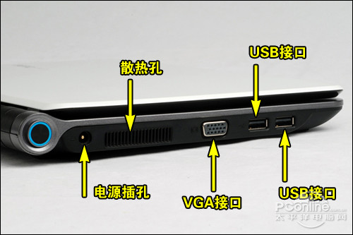 就接口数量上而言,除不支持主流HDMI高清输出接口外,明基U121的接口与普通10寸机身上网本采用同样配置。机身左侧列有VGA接口、两个USB接口、电源插口,机身散热孔也被设计在这里。