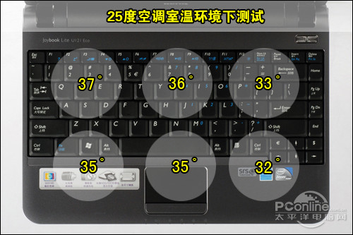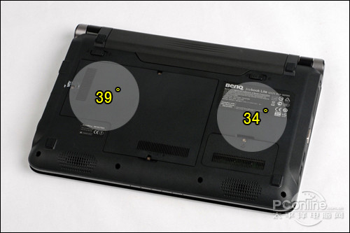 在机身散热问题上,明基U121搭载的Atom平台平台表现较为一般。在测试机身散热时,机身左托掌区域的温度为35度,长时间操作中略感温热。此外,同样是左托掌区域的机身底部,温度达到了39度左右,放在腿部操作是不太可能了。