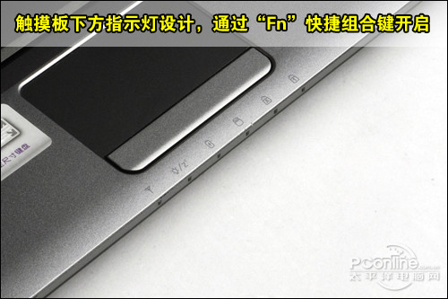 明基U121没有配备额外快捷键,只提供了“Fn”快捷组合。虽然没有直接提供额外的快捷键,但是结合触摸板下方指示灯设计,用户通过“Fn”快捷组合可以很方便掌握机身运行状态。此外,当系统进入睡眠状态或者合上顶盖后,指示灯区域也可已从机身前端观察到。