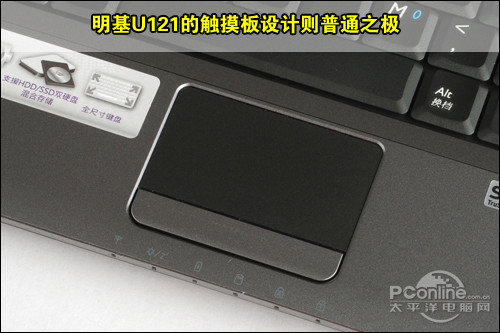 相比键盘的出色设计,明基U121触摸板设计则普通之极,与传统笔记本触摸板相比,明基U121触摸板并不宽大,使得用户在进行操作时有着很大局限性。 但触摸板工艺设计较为不错,采用磨砂质感处理,使用户在操作时流畅度与触感皆为舒适。触摸板鼠标的左右按键采用一体化设计,手感略微生硬,实际使用表现较 为一般。