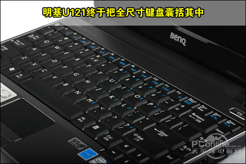 机身娇小的上网本在键盘设计上一直较为用户关心,过小的键盘设计很容易带给用户不良操作体验。明基U121则没有这方面顾虑,得益于12英寸机身体积, 键盘设计充分利用了空间,明基U121终于把全尺寸键盘囊括其中,使得其在操作舒适度上有了质的飞跃,达到了常规尺寸笔记本产品水准。