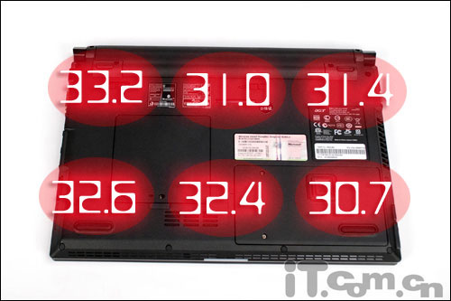 对于温度测试方面,我们将这款宏碁TM8371G键盘面板和底部面板划分成为6个区域。对每个区域使用红外测温仪进行各3点的测温,我们在开机运行50分钟进行测量。