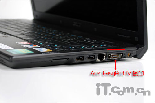 那么问题就出来了,这个Acer EasyPort IV插槽是用来干什么的呢?原来,所谓EasyPort(易插得)设计,就是通过一条线缆与笔记本电脑相连,另一端,则可以扩展出许多连接端口的一种硬件设备。因此,只要有了易插得,用户只须把各种连线连接到易插得相应的接口上,再把易插得与笔记本相连就可以了。这一样一来,既节省了时间,又减少了重复工作,大大提高了效率还充分节约了机身空间。而我们之前所提及的问题也迎刃而解了。