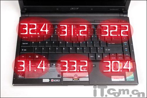 对于温度测试方面,我们将这款宏碁TM8371G键盘面板和底部面板划分成为6个区域。对每个区域使用红外测温仪进行各3点的测温,我们在开机运行50分钟进行测量。