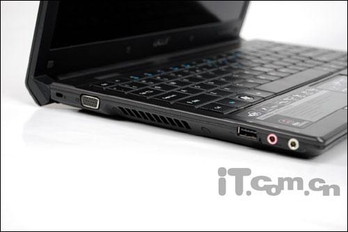 机身左侧的端口设计也显得十分稀松,配备有一个安全锁槽,一个VGA插孔,一个USB2.0和一组音频输入/输出插孔,其余区域则是CPU风扇出风口。机身右侧就属于整机的端口重地了,配备有一个多合一读卡器插槽,两个USB2.0端口,一个网线插孔,一个Acer EasyPort IV接口和一个电源适配器插孔。机身后侧同样不配备有任何端口。