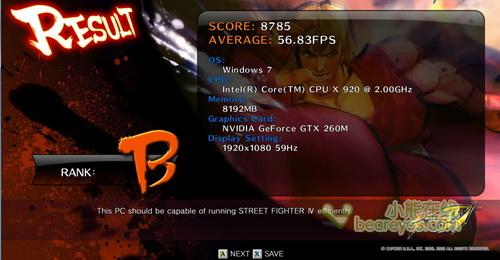 在开启全部特效后,游戏测试程序最后的分数为8785,平均帧数为56.83。可以说这个成绩在目前笔记本产品中是非常少见的高分,绝对展现出了该机的游戏实力。