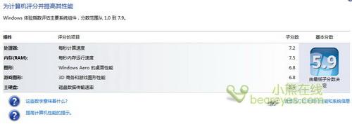 在Windows 7中的体验索引与之前Vista中稍有不同。Windows 7体验索引的具体评测项目虽然依然为CPU计算能力、内存运行能力、Windows AERO桌面图形能力、游戏图形能力、硬盘数据传输能力五项,但是每项的评分区间由 Windows Vista的1.0-5.9扩展为1.0-7.9,得分越高表明硬件的单项性能越强。我们看到,这款戴尔Alienware M15x凭借着强大的硬件优势,基本分数达到了5.9,非常优秀。