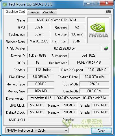 NVIDIA GeForce GTX 260M是目前NVIDIA在笔记本显卡中最高端的型号之一,完全可以算作是NVIDIA上一代顶级笔记本显卡Geforce 9800M GTX的升级版。该显卡在制造工艺上从65nm升级到了55nm,同样基于G92M核心设计,拥有7.54亿个晶体管,112个流处理器,显存位宽为256位,最高可以配备1GB GDDR3独立显存。
