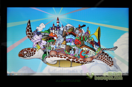 毫无疑问,在所有的15英寸机型中,这款绝对是最庞大的。我们看到,该机的屏幕采用了15.6英寸WideFHD LED背光屏幕,分辨率达到了1920 x 1080,极大的满足了游戏用户对显示方面的需求。另外,在该机屏幕表面还设计有一层保护膜,安全性能还是不错的。当然,反光也是不可避免的。下面就让我们来看看实际效果吧。