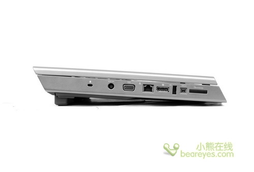 机身左侧是安全锁孔、电源接口、VGA接口、网卡接口、Display Prot接口、USB接口、1394接口以及多合一读卡器(MMC\SD\MA\PRO)