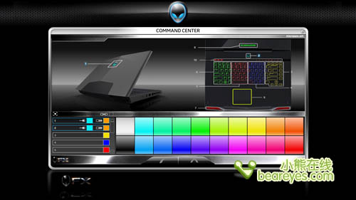 看过我们之前Alienware M17x评测文章的朋友都一定还记得,外星人的这身“盔甲”不仅坚固,而且还是极其奢华的。同样,戴尔Alienware M15x也为玩家们特意准备了Command center灯光效果控制软件。在软件中我们可以对屏幕上盖LOGO、键盘、触摸板、前端灯光等等进行详细的设置,充分考虑到了玩家在各种游戏中的实际感受,而且整个操作也是非常方便的。