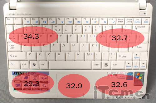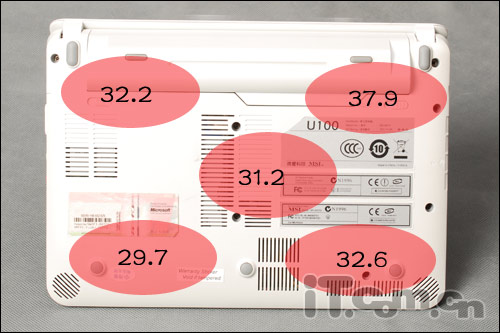 小编在开机运行微星U100 4小时左右,用红外探温仪考察机身表面和背面的重点部位的温度。通过红外测试我们发现整款本本的最高温度是在触摸板的位置,但也仅有36度左右,完全没有超过我们人体的基本温度,看来微星U100的散热还真是相当出色的。看来微星U100这么优异的散热性能还真是要得益于机身背面多处散热孔的设置了。