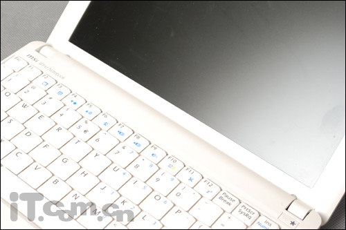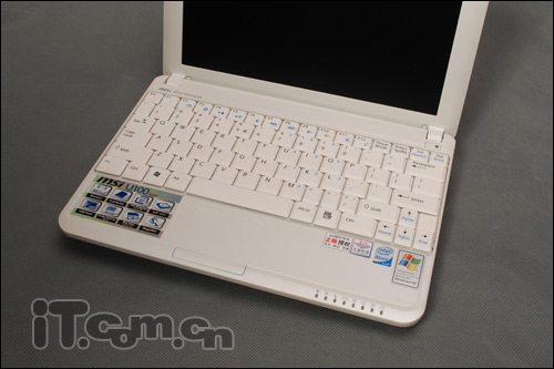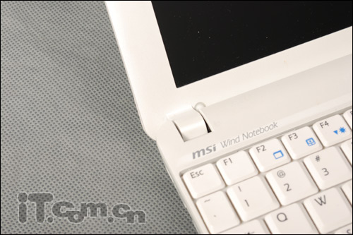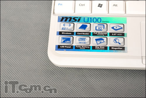 由于尺寸的关系,我们看到除了右上角的开关键,微星U100没有设计其他的快捷键,但是用户可以利用Fn的转换依然可以实现快捷键的作用,也是非常方便的。而在左上角是微星U100的型号名称“mis wind notebook”的字样。