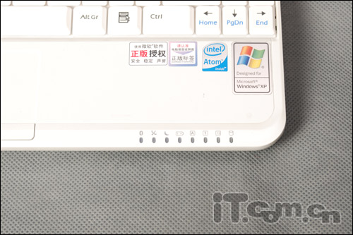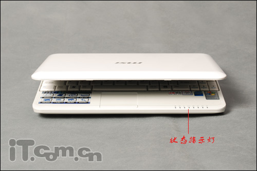 而在右掌托处则粘贴了关于微星U100的intel Atom的处理器、预装了XP的操作系统等知识,供用户可以简单的对这款本本有一个直观的了解。另外我们看到在本本的右掌托处还有着一排状态指示灯,在开机状态下,用户可以清楚的了解本本的工作状态。