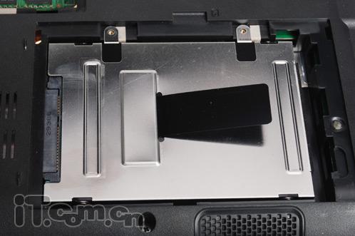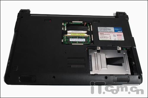 华硕UL80VT的底盖采用的并不是一体式的设计,方便于维修和升级的工作,接下来我们对华硕UL80VT的底部进行了简单的拆卸,我们看到华硕UL80VT可以提够两处的可拆卸的部分,分别是硬盘和整机的内部系统。首先从底部的设计有众多的散热口就能很好知道,在散热方面华硕是下了很大的功夫的。而底部的硬盘和内存都提供了方便的拆卸。