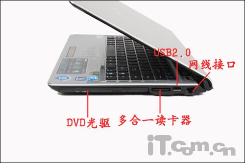 右侧接口依次是:DVD光驱、多合一读卡器、USB2.0接口以及网线接口。