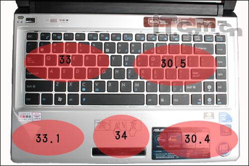 下面是小编在开机运行华硕UL80VT 4小时左右,用红外探温仪考察机身表面和背面的重点部位的温度。通过红外测试我们发现华硕UL80VT的最高温度是在机身背面左上角处,达到了39.7度左右,虽然超过了人体的标准温度,但也还是在我们的接受范围之内的。