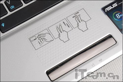 华硕UL80VT的触摸板采用了多点触摸技术,对于窗口的调节等操作可以轻松完成,同时采用了塑料镀膜技术,通过塑料镀膜可以清晰的看到有灰色暗点,让触摸板部分避免了指纹的侵袭,这应该算华硕的创新之一吧。