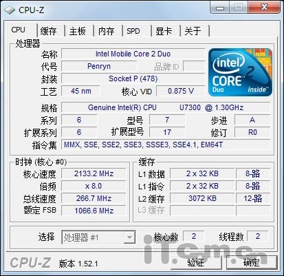 通过对随机Intel Core2 Duo U7300处理器在CPUz下的截图可以看出,酷频33软件对于处理器最大的改善就是通过对外频和倍频的改变令处理器的核心频率得到大幅提升。在超频状态下U7300的主频提高了60%以上,从1.33GHz超频到1.73最高可达2.1GHz。仅从频率来看已经是目前的CULV处理器中最高的。