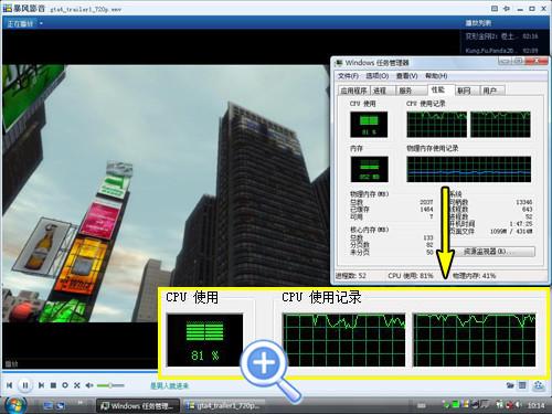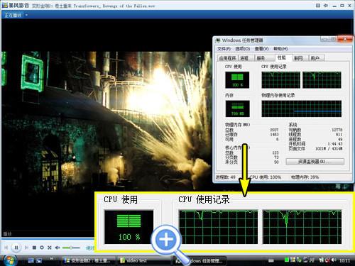 影片播放测试方面我们选用了两个片源,分别是720P高清和1080高清播放过程全程使用N270处理器进行软解码。可以看到,戴尔Latitude 2100能够顺畅的播放720P的,声像也能够同步,CPU占用率始终维持在81%,因此如果再同时运行其它软件的话就显得十分吃力了。再来试一下1080P的,占用100%处理器,同时也已经出现明显的卡帧现象,播放过程中声像也出现不同步,看来是不能胜任1080P播放了。