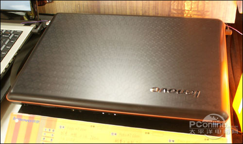 在外观造型上,联想 IdeaPad Y550A-TSI(A)(灰)还是与整个Y系列保持一致,采用的是类肤漆材质,不易受到指纹的侵扰,配以交错的六角蜂窝纹路,四周由一条橙色细边包围。 边角的银色LOGO显得很低调,整体设计体现出一种勤劳、智慧、乐观的精神,非常Smart。由于15.6英寸的屏幕为16:9的比例,机身会显得偏向修 长。采用了色彩和亮度表现都十分出色的LED背光屏,1366×768的高分辨率,在欣赏影视作品时效果很好。在键盘上,直接套用了ThinkPad的高 触感键盘设计,表现自然相当优秀的。