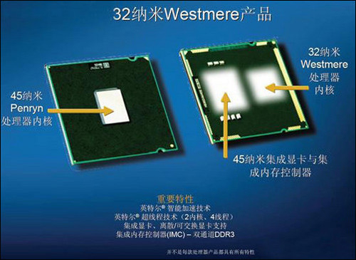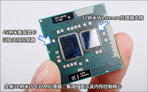 Core i5/i3/i7三款处理器,全部自带图形核心,不过和AMD的思路不同,Intel暂时未将处理器模块和图形核心模块(含内存控制器)完全融合在一起,而是直接封装在一块基片上,二者的制造工艺也不同,分别是32nm的处理器核心和45nm的显示核心。