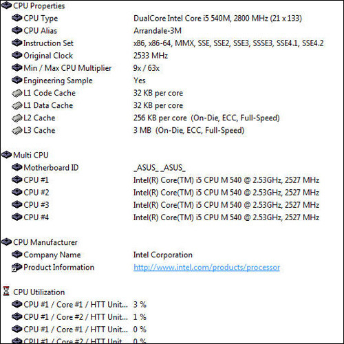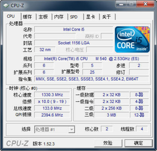 全新的i5 540M处理器详细信息,从上图可以看到二个处理器核心在HT超线程下均显示四个核心,i5 540M可同时处理四个线程操作,大幅增强其多线程性能。