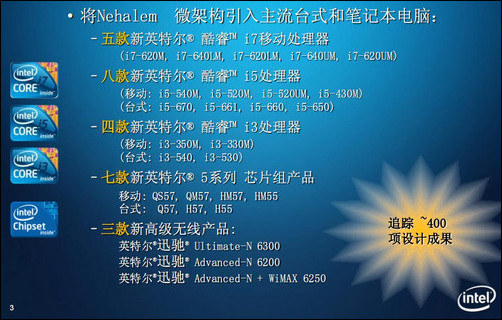 今年面向高中低端市场分别对应Core i7、Core i5和Core i3,之前的Core 2 Duo、Core 2 Quad、Core 2 Extreme将逐渐淡出市场,这也意味着酷睿2时代已经离去,处理器标识再次得到简化,而我们熟知的Pentium、Celeron、Atom等处理器品牌将会继续存在,分别面向入门级桌面市场和Netbook、MID等超移动领域。