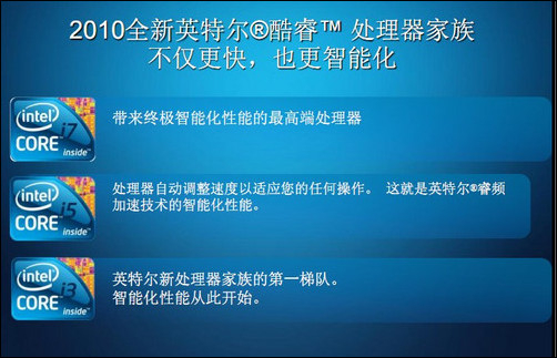 全新的i5 i7系列双核处理器,与之前的45nm四核i7相比制作工艺再次得到提升至32nm,同样基于Nehalem架构,全部拥有三级缓存系统、睿频加速技术、集成内存控制器等技术,从下图可以看出全新的酷睿i家族的分类,至尊级的酷睿i7四核以及双核处理器,中端的i5系列处理器,以及处以入门性价比系列的i3处理器。(入门级别i3不支持睿频技术)