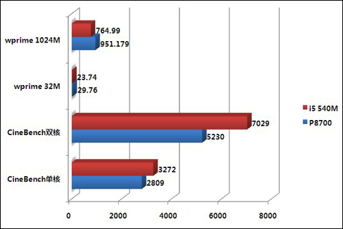 通过对比测试成绩可以看到新的i5 540M的最终测试成绩与P8700的成绩相比提升也是比较明显的,在相同的频率下i5 540M的CineBench R10的最终成绩高出P8700百分之30左右,全新的32nm的制作工艺再次刷新了处理器的性能,预计全新i5 540M处理器平台下的机器价格较P8700处理器要便宜不少,本次评测华硕的K42预计上市价格为6000元左右,性价比不错!