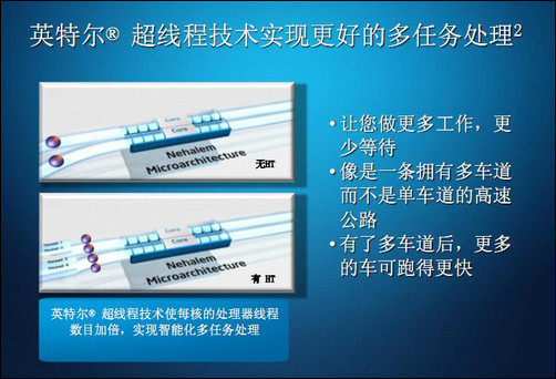 超线程技术只需要消耗很小的核心面积代价,就可以在多任务的情况下提供显著的性能提升,比起完全再添加一个物理核心来说要划算得多。比起Pentium 4的超线程技术,Core i7的优势是有更大的缓存和更大的内存带宽,这样就更能够有效的发挥多线程的作用。按照的说法,Nehalem的HT可以在增加很少能耗的情况下,让性能提升20-30%。
