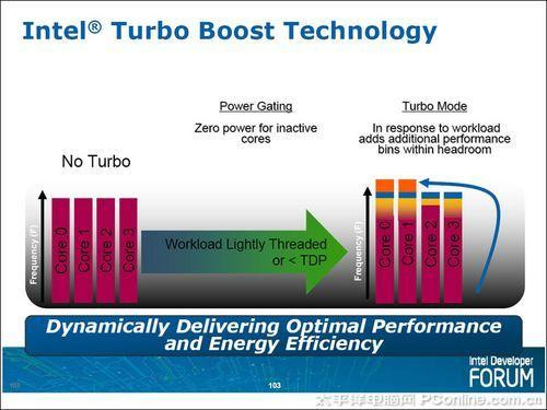 Turbo Boost,加速技术,它基于Nehalem架构的电源管理技术,通过分析当前CPU的负载情况,智能地完全关闭一些用不上的核心,把能源留给正在使用的核心,并使它们运行在更高的频率,进一步提升性能;相反,需要多个核心时,动态开启相应的核心,智能调整频率。这样,在不影响CPU的TDP(热功耗设计)情况下,能把核心工作频率调得更高。