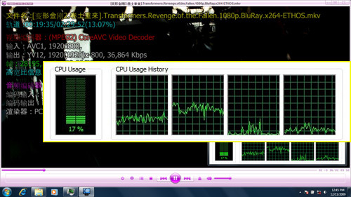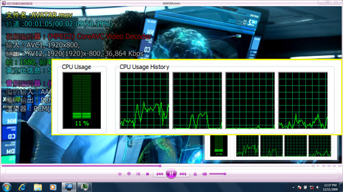 高清播放测试,我们使用H,264编码1080P高清规格的《阿凡达》进行测试,CPU平均占用率大概在17%左右,表现较上一带集显提升明显;高清播放的同时用户还可以进行其它程序和应用操作。