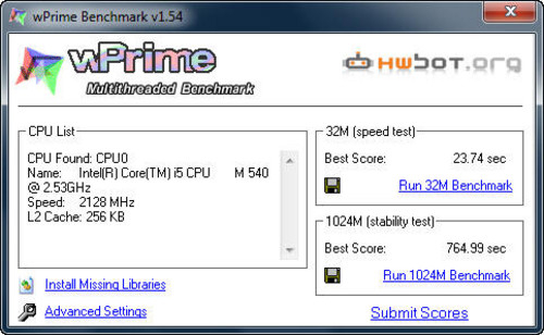 wPrime是一款与Super Pi相似的圆周率计算软件,但与Super Pi只能支持单线程不同的是,wPrime最多可以支持八个线程,也就是说可以支持八核心处理器,并且测试多核心处理器性能时比Super Pi更准确,本项测试分值越低越好。