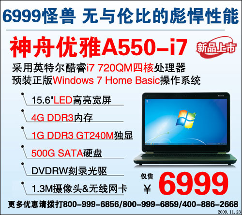 6999元四核酷睿i7怪兽本神舟大A550