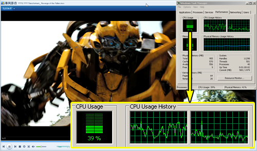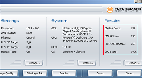 技嘉 Q1458L的显卡采用英特尔GMA X4500集成显卡,通过3DMark测试,在分辨率1024×768下取得657分。从分数来看,显卡表现很弱,只能满足基本的图形处理。播放高清视频CPU占用率在39%左右,画面比较流畅,看来技嘉 Q1458L对付高清视频问题不大。不过在进行一款稍高端3D游戏测试时,画面犹如播放PPT,无法正常运行,看来技嘉 Q1458L也只能满足用户进行2D游戏娱乐。