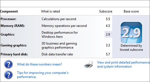 首先进行Windows 7自检测试以便大概了解整机性能,通过测试技嘉 Q1458L取得2.9分,显然这一分数表现较低;不过细看低分是由于整机显卡较弱原因,其他项的得分令人比较满意,处理器取得5.5分,硬盘取得5.7分。