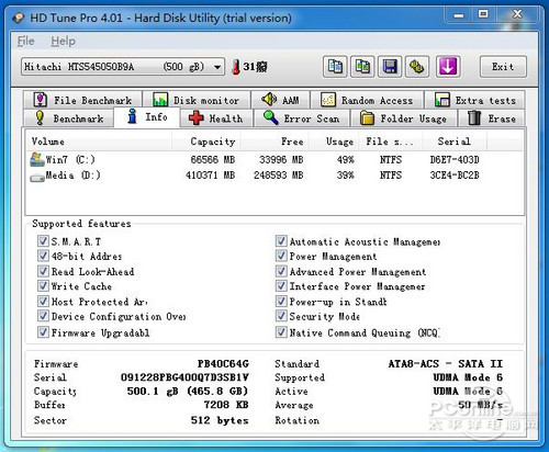 HD Tune作为老牌劲旅一直是不少用户推荐的。HD Tune是一款小巧易用的硬盘工具软件,其主要功能有硬盘传输速率检测,健康状态检测,温度检测及磁盘表面扫描等。另外,还能检测出硬盘的固件版本、序列 号、容量、缓存大小以及当前的Ultra DMA模式等。虽然这些功能其它软件也有,但难能可贵的是此软件把所有这些功能积于一身,而且非常小巧,速度又快,更重要的是它是免费软件,可自由使用。