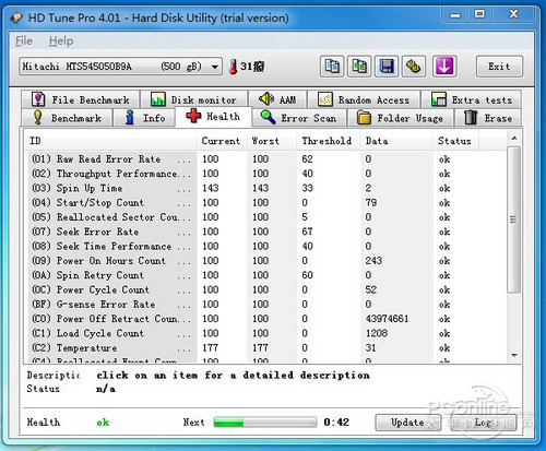Power On Hours Count:工作小时计数,这里显示为243,表示这块硬盘总共工作了243小时。(西数硬盘的时间是以小时计算,富士通是以秒计算,三星是以分钟计算,其他硬盘则分型号)