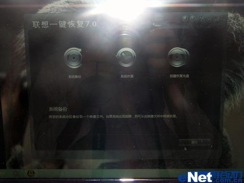 在键盘上方,联想V460提供了一排静电式触感按键,突出的按键就是电源键和一键恢复按键,再就是音响,比较普通的音响,预计在下代产品V470上可能会出现诸如通过杜比认证的音响设置。