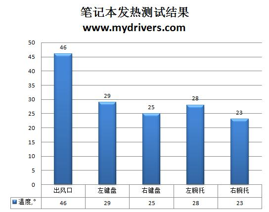 由于散热系统基本集中在笔记本左侧,因此右手的键盘和腕托处温度都不高,摸起来只有微温的感觉。左侧的键盘和腕托略微高一点,并不影响用户使用。出风口的温度达到了46度,比室温高出18度,热气比较明显, 好在出风口背对用户,桌面使用时用户也不会感觉到,如果是放在腿上感觉可能更明显。