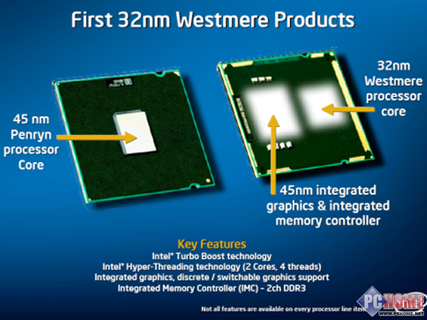 英特尔公司在年初发布了基于全新架构的新酷睿处理器家族,其正式命名为酷睿i7/i5/i3。新处理器将传统意义上的集成显示核心单元(GPU)封装在处理器芯片内,形成了“一块芯片,两颗核心”的布局。与其说Arrandale整合的是GPU,不如说是整合了一个集成GPU单元的北桥芯片—包含内存控制器+PCI-E通道控制器+DMI总线控制器+GPU。