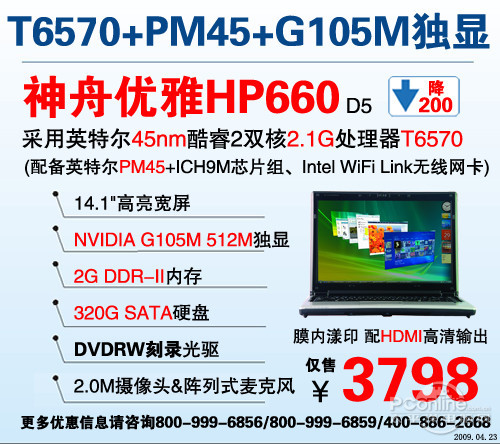 同样优惠200元促销的优雅HP660D5售价3798元,是神舟面向中端市场特推的一款集游戏、商务于一体的高性价比机型。同样升级采用的512M G105M独立显卡,65纳米制程,在处理图形密集型应用程序和任务上更富有成效,各项测试数据显示,它拥有较原93GS显卡提升30%以上的优异性能展现,是您尽享Vista以及畅玩当今流行游戏等日常计算应用的理想选择。此外,增设的内置200W像素摄像头、阵列式麦克风和1000AN无线网卡,也将移动应用与高清的网络视频应用相结合,提供良好清晰的通话环境和卓越的影音传输条件,为消费者带来更自由舒适的用机享受。