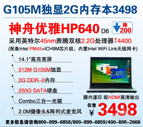 【4月23日太平洋电脑网湖南站】在过去6年取得飞速发展的神舟电脑,被业内公认其在中国笔记本电脑市场的占有率已跻身前三位。五一前夕,神舟在14.1寸主流应用笔记本电脑市场重新布局,旗下G105M独显2G内存双核系列优雅HP640/HP660火爆降价促销,仅售3498元起,为消费者构建同价位上最高效的家庭娱乐平台。