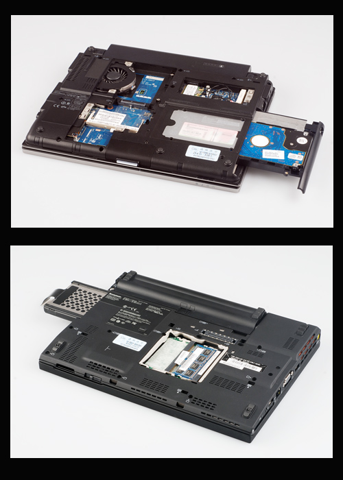 通过上面的全面对比想必小张对这两款商务笔记本有了更深程度的了解,但是两款机型在扩展,配置及性能方面的表现如何呢?下面将详细解析,首先来看扩展性两款机型在机身设计上面各具匠心,扩展升级方面惠普2540的所有关键部位均在底部,内存区域预留了一条内存插槽(另一条内置2G内存在键盘底部),硬盘采用插拔的设计非常方便用户升级。