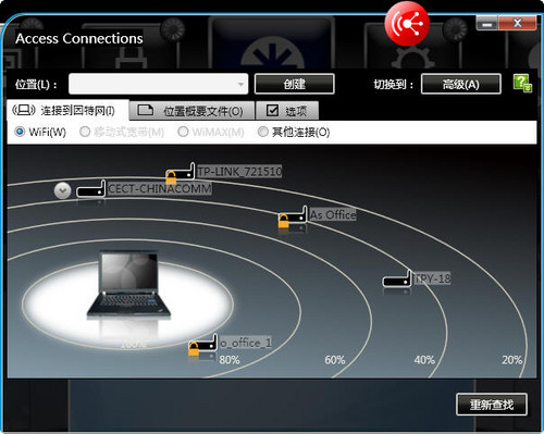 X201的随机无线管理软件非常方便的查看你电脑周围的无线信号,更有极为方便的网络环境记忆功能,如果你经常去一个客户那里拜访需要使用对方的无线网络,你只需要设置一次,自动记忆,下次如果再去则会自动记忆非常方便。