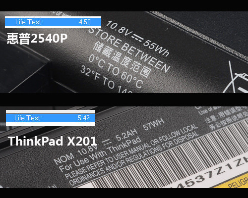 通过续航对比可以看出5.2AH 57WH的联想X201续航达到了5小时42分钟,而55WH的惠普则为4小时50分钟相差不到1小时,虽然没有低电压机型的8-10小时的续航,但是两款机型均能满足商业用户的基本续航表现。