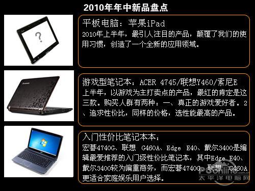 由于时间的原因,今次仅回顾了上面年比较主流和大众的笔记本,另外商务类、轻薄类、女性比较关爱的产品以及上网本没有涉及,对此类产品关注的朋友,敬请关注《年中回顾 2010年编辑最常推荐笔记本盘点下》。